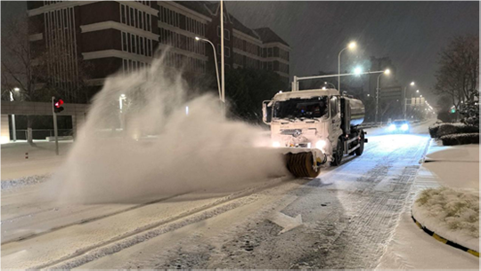 為確保城市主干道及橋梁暢通,建發(fā)公司緊抓夜間作業(yè)窗口,秉持“人歇車不歇”原則,調(diào)配精良設備與人員,對易結冰的橋面及主干道進行高強度清除作業(yè)。作業(yè)人員利用后半夜車流較少的時機,集中操作雪滾車、撒布機等設備,并同步在關鍵路口鋪設防滑墊。截至20日17時,累計投入各類機械16臺、作業(yè)人員320名,撒布融雪劑60噸,有效保障了主要道路的安全通行。