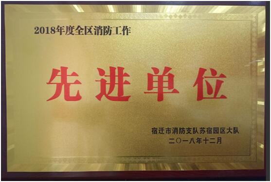 公司在2018年度全區(qū)消防安全工作評定中,喜獲“2018年度全區(qū)消防工作先進(jìn)單位”榮譽(yù)稱號(hào),此次消防安全工作由宿遷市消防支隊(duì)蘇宿園區(qū)大隊(duì)評定。