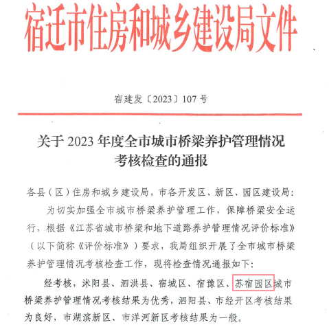 近日,宿遷市住房和城鄉(xiāng)建設(shè)局下發(fā)2023年度全市城市橋梁養(yǎng)護(hù)管理情況考核檢查通報,園區(qū)城市橋梁養(yǎng)護(hù)管理工作再獲佳績。